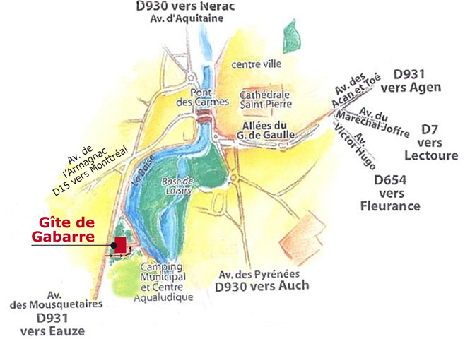Depuis le centre de Condom, sortir par la D931 en direction d'Eauze puis tourner à gauche au niveau du magasin STOREA2 (100 mètres avant le Centre Aqualudique)